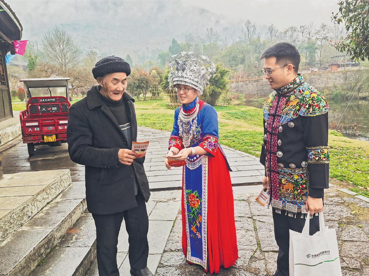 遵义市分行还利用营业网点遍布城乡的优势,联系村委会、居委会,利用乡村大喇叭滚动播放宣传提示语,提升群众的风险防范意识。图为该分行员工在仡佬族聚居地开展相关宣传活动。