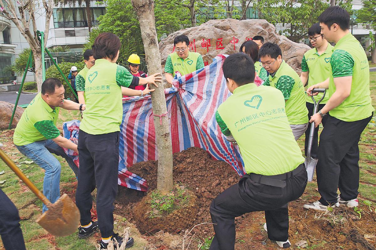 3月12日是第47个全民义务植树节,广州邮区中心开展了义务植树活动。活动现场,志愿者们热情高涨,挥锹铲土、摘叶剪枝、扶树培土、提桶浇水,大家团结协作、干劲十足。□陈原翰 陈绪民 摄影报道