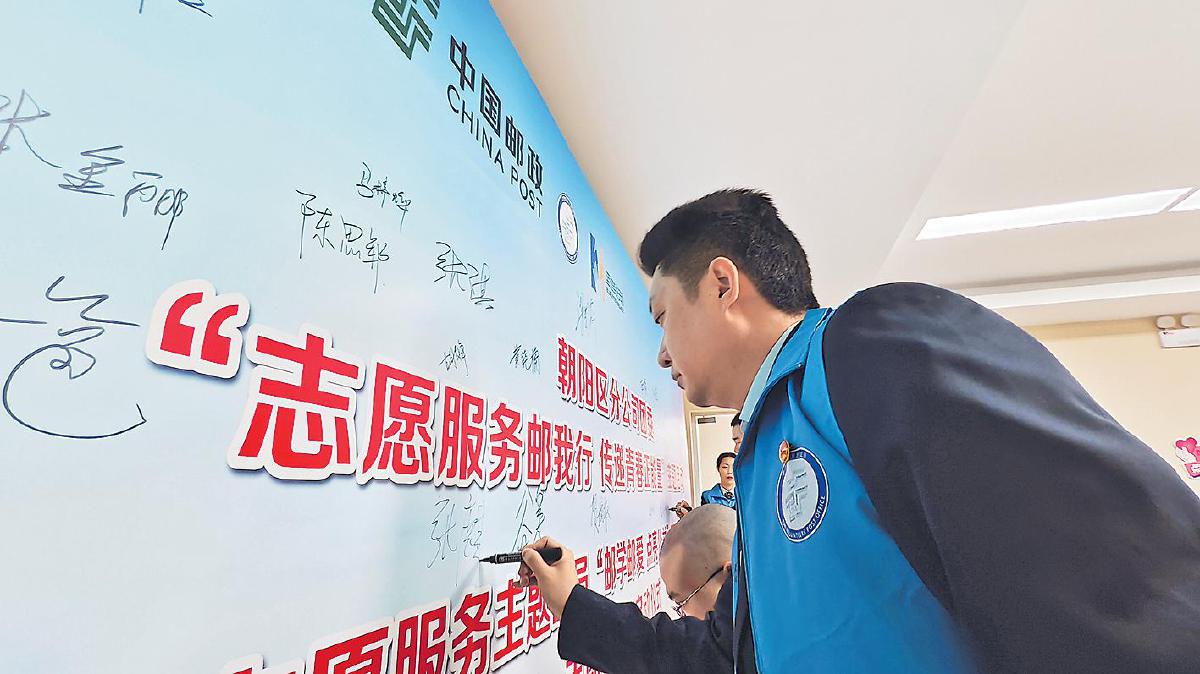 北京邮政青年志愿者在主题墙上签下自己的名字,立志为志愿服务贡献更多力量。