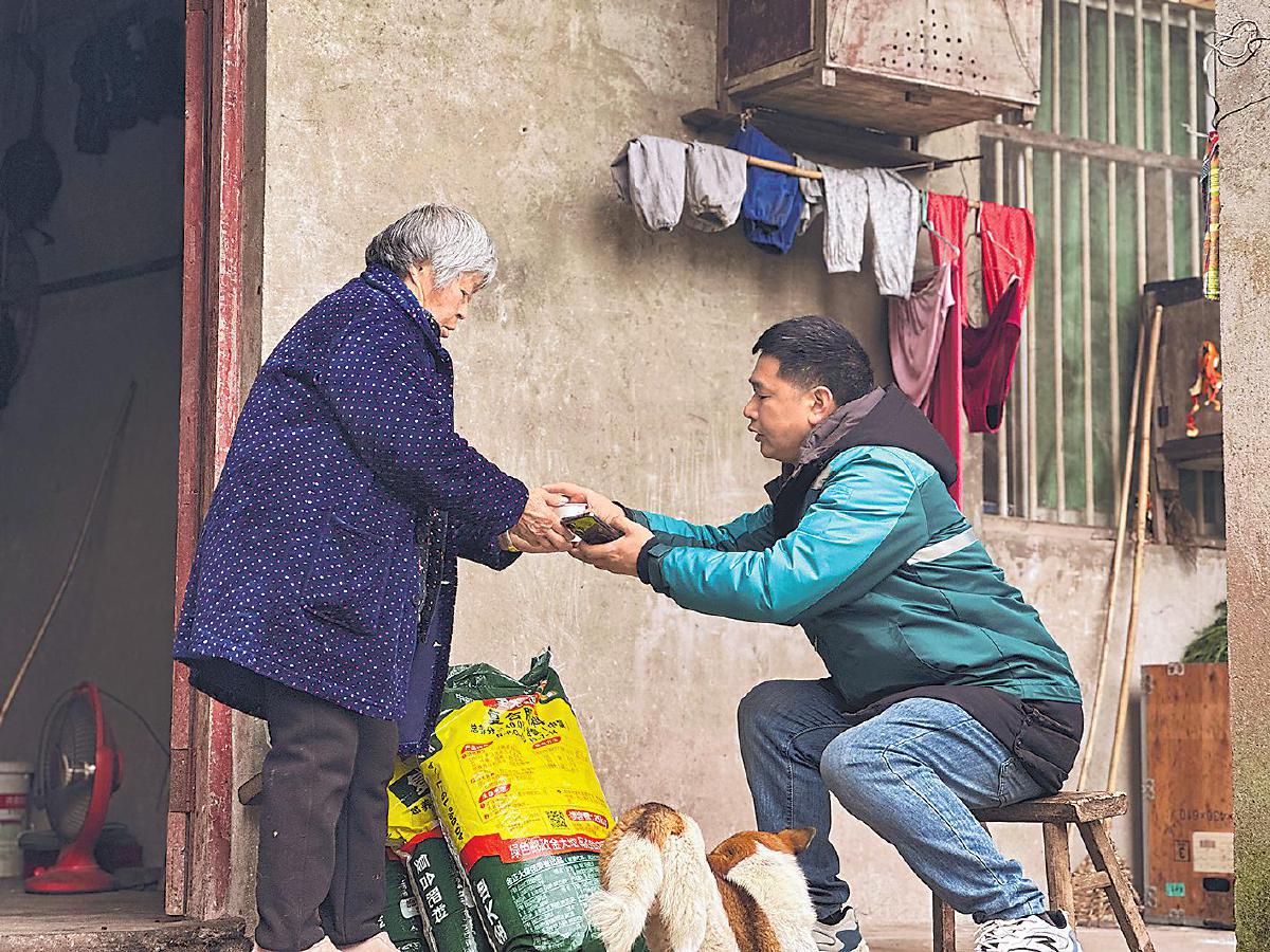 广安市邮政分公司投递员一大早将化肥送到农户家中,农户端出一杯水表示感谢。 □刘双华 摄