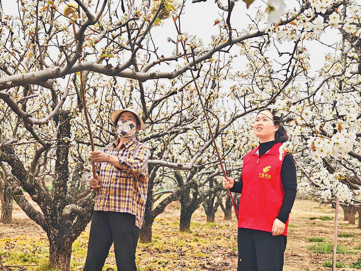 安徽省砀山县的40万亩梨花眼下进入盛花授粉期,田间地头一派繁忙景象。针对部分帮扶对象家庭人手少、劳动力不足等状况,砀山县邮政分公司党支部组织党员志愿者,深入帮扶村开展助农授粉活动,帮助果农抢抓农时,保证梨树坐果均匀,丰产丰收。