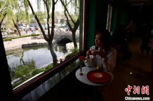 主题邮局推出特色咖啡及甜点,临窗卡座受到游客欢迎。设计师巧妙运用“框景”手法,宽阔的玻璃窗仿佛取景器,让游客通过新视角观赏万宁桥的碧波垂柳、火德真君庙的飞阁重檐。