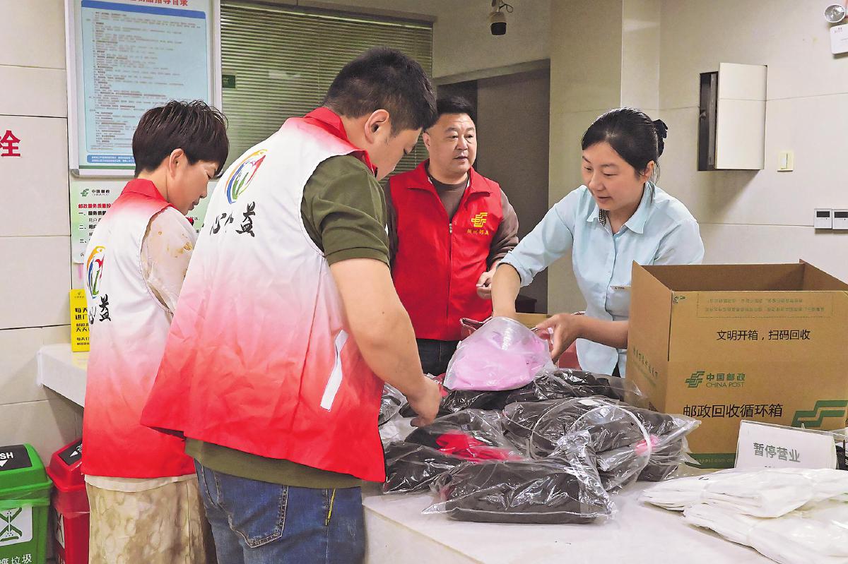 4月23日上午,在浙江省湖州市吴兴区邮政分公司红旗路营业网点,邮政工作人员将湖州一心公益服务中心送来的350余件爱心衣物装入统一规格的邮政纸箱中,寄往四川汶川。从揽收、打包到发运,邮政全环节“护航”这批公益包裹,为汶川受助学生送去湖州市民的一份“牵挂”。