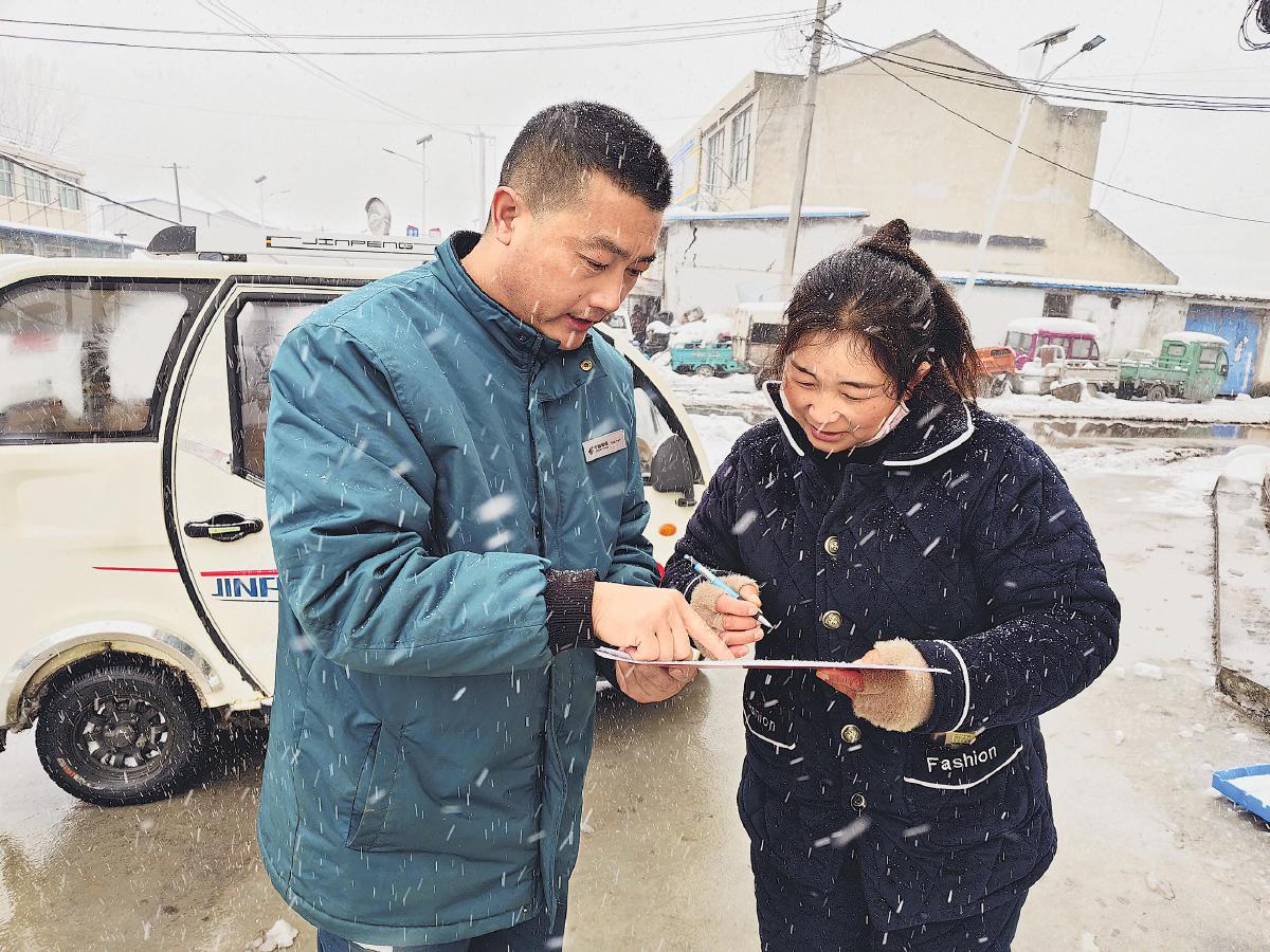 风雪中,刘雷锋为客户投递急需的证件。