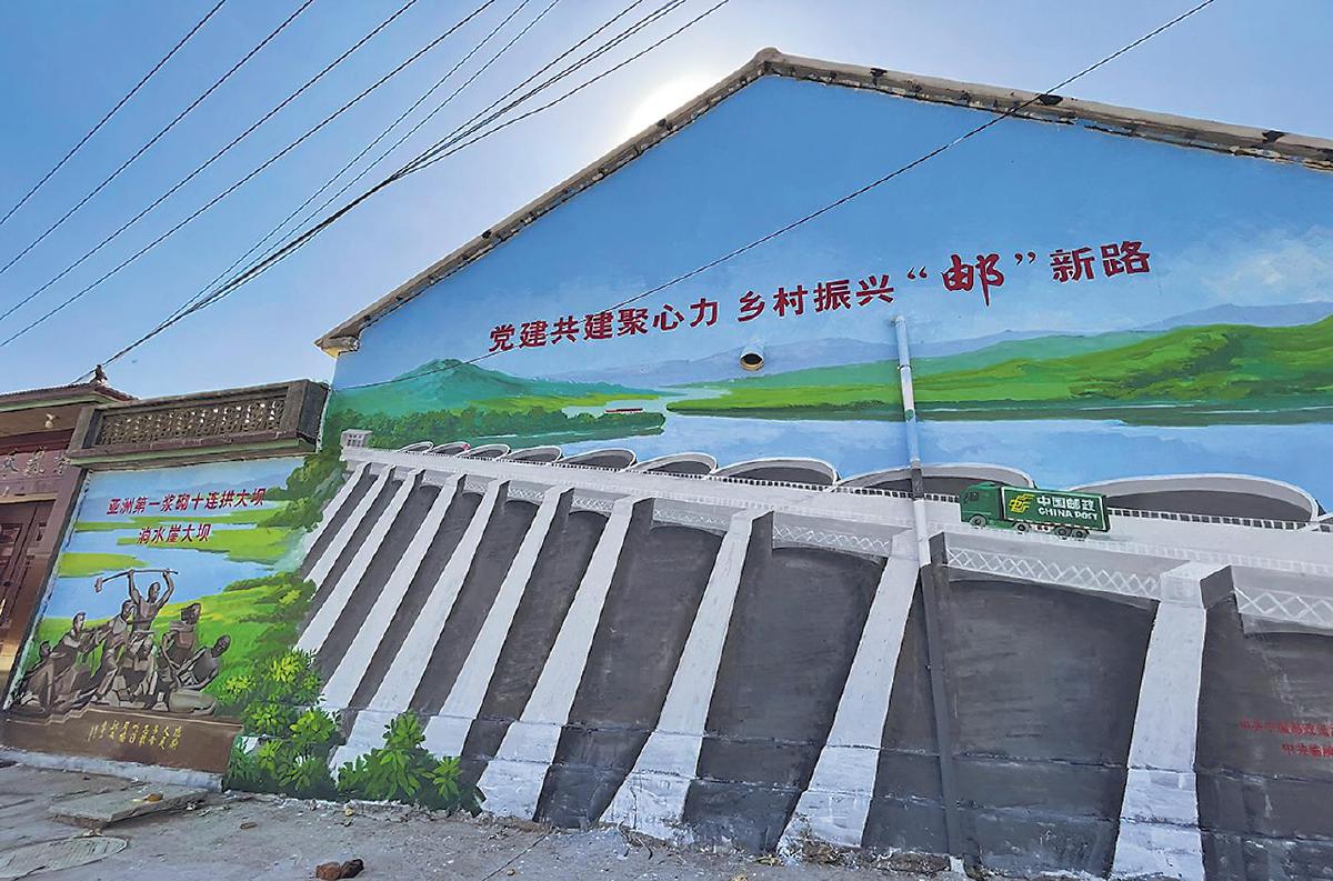 近日,山东省临朐县邮政分公司联合该县九山镇宋家王庄村党支部,以乡村振兴为主题,在村里主干道两旁的村民房屋外墙上创作了一组融合“党建红+邮政绿”与地域特色的主题墙绘,将红色文化、邮政担当与淌水崖精神有机结合,为美丽乡村建设增添了一道灵动的风景线。
