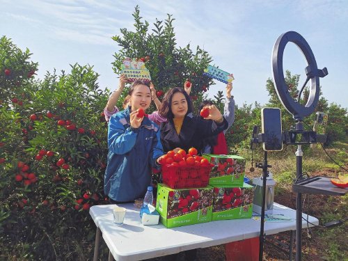铜梁邮政主播与村干部联手在柑橘园内开展助农直播。 □杨洋 摄