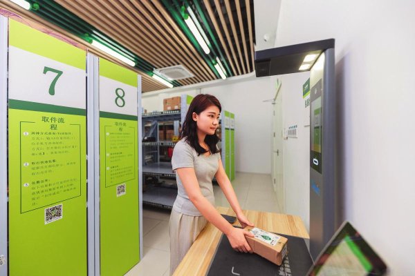 8月20日,在安徽省合肥市科大讯飞小镇,客户在邮政无人驿站扫码领取邮件。