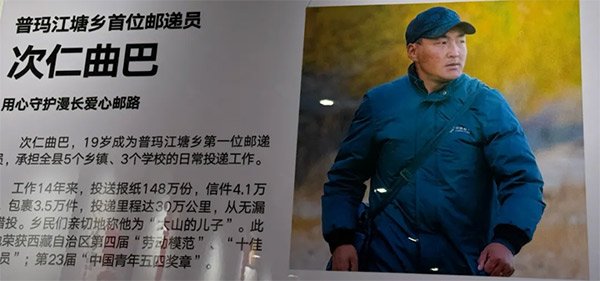 离开普玛江塘前,普玛江塘乡党委副书记、人大主席洛桑久乃热情地邀请采访组参观位于乡政府内的边境红色教育基地。在普玛江塘杰出人物展区,记者一下就看到了次仁曲巴事迹的展板,2019年他荣获了第23届“中国青年五四奖章”。洛桑久乃充满感慨地说:“中国邮政和我们地方党委、政府一样,无论谁来谁走,都会永远坚守在这高寒的边境线上。乡亲们需要我们,国家需要我们!”
