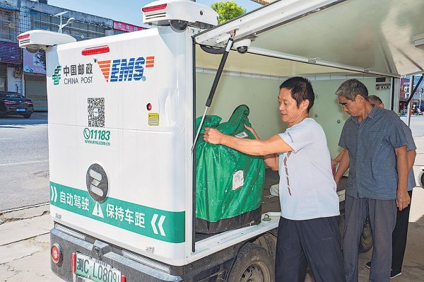 10点整,随着电机嗡鸣声从村口传来,当天首趟无人车稳稳地停在厚坡镇韦集村便民服务站门口。便民服务站老板孙均波已在门口等候,见车停下,他脚步轻快地迎上去,用手机一扫描,随着清脆的“咔嗒”声,无人车柜门弹开。他把邮件取出来,说:“以前在电视里见过这高科技,做梦也没想到无人车能开到俺村来!这小车可机灵了,遇到行人会自动避让,到了村口还会播报取件信息。”