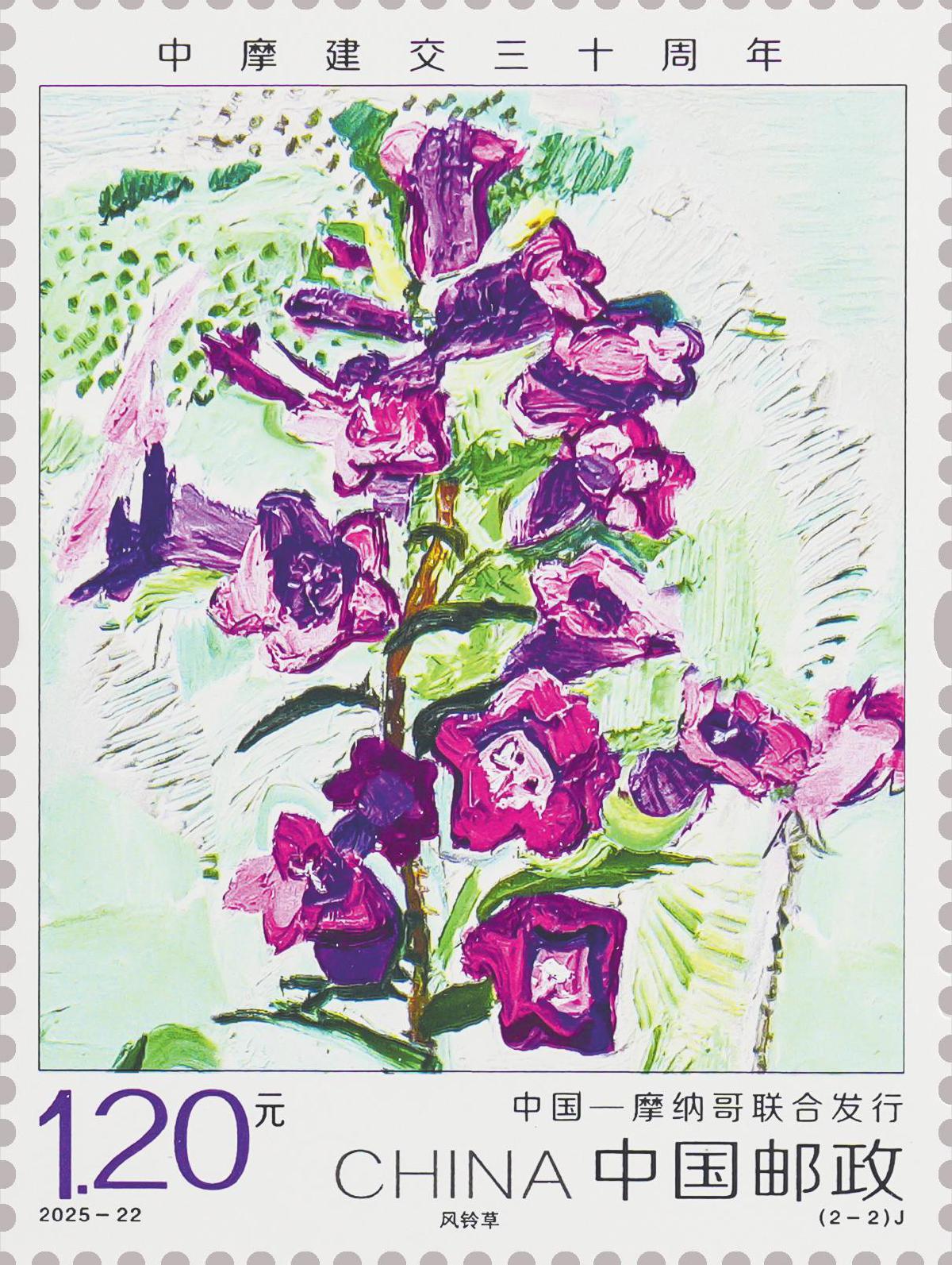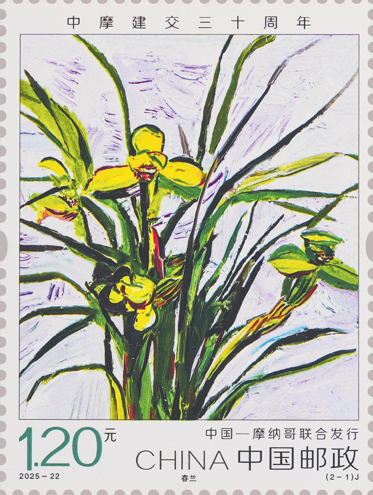 本套邮票分别选用具有两国民族特色和深厚文化内涵的花卉,中国选用栽培历史悠久的春兰,摩纳哥选用美丽灵动的风铃草,两种花卉彰显出生态文明的内在价值与精神追求。邮票图案采用油画表现方式,设计师通过大胆的构图、恣意的笔触、灵活的色彩搭配,对具体的物象进行抽象提炼,从而营造出一种生动而富有生命力的画面效果。两枚邮票承载着“友谊长存”的深层寓意,希望中摩关系不断取得新进展,更好造福两国人民。