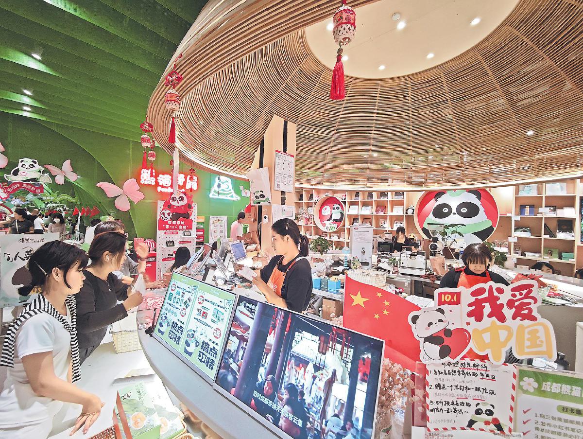 “盖完这枚‘巴适’方言章,给女儿的国庆礼物就集齐了!”苏州游客王先生手持“护照本”,在盖章区加盖纪念章。精心挑选明信片的顾客在千款图案前流连忘返,咖啡区坐满了手持熊猫主题饮品的游客,留言墙上贴满了对祖国和成都的祝福语。这热闹的场景,正是熊猫邮局作为文创地标影响力的生动体现。它不仅是一处邮政服务场所,更是连接传统与现代、传递成都文化与熊猫文化的重要枢纽,让每一份国庆心愿跨越山海抵达目的地,也让成都的文化魅力随着一枚枚熊猫邮戳传播到世界各地。