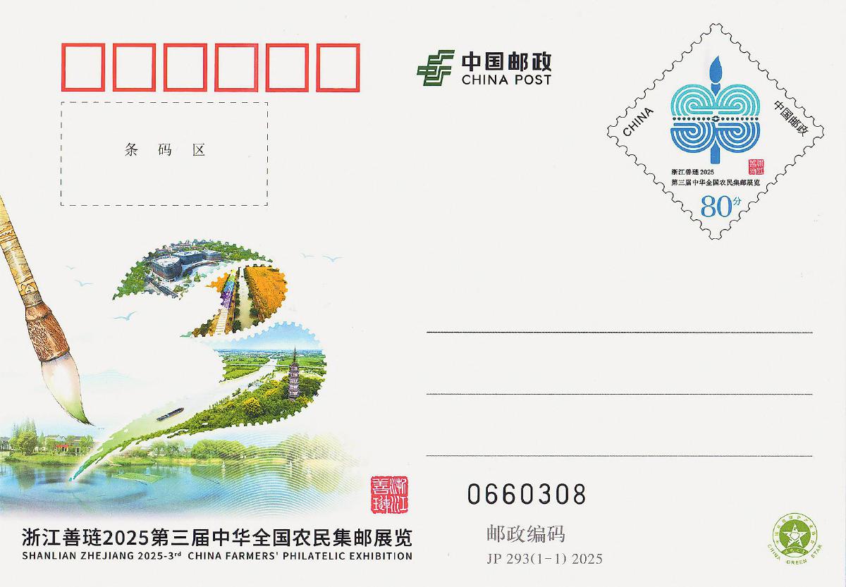 展览集中展示全国28个省级邮协精选的146部、450框“三农”题材邮集,涵盖传统、邮政历史、专题等10个竞赛类别,特别增设19部、30框书信集邮非竞赛单元。中国邮政为本次邮展特别发行《浙江善琏2025第三届中华全国农民集邮展览》纪念邮资明信片1枚。