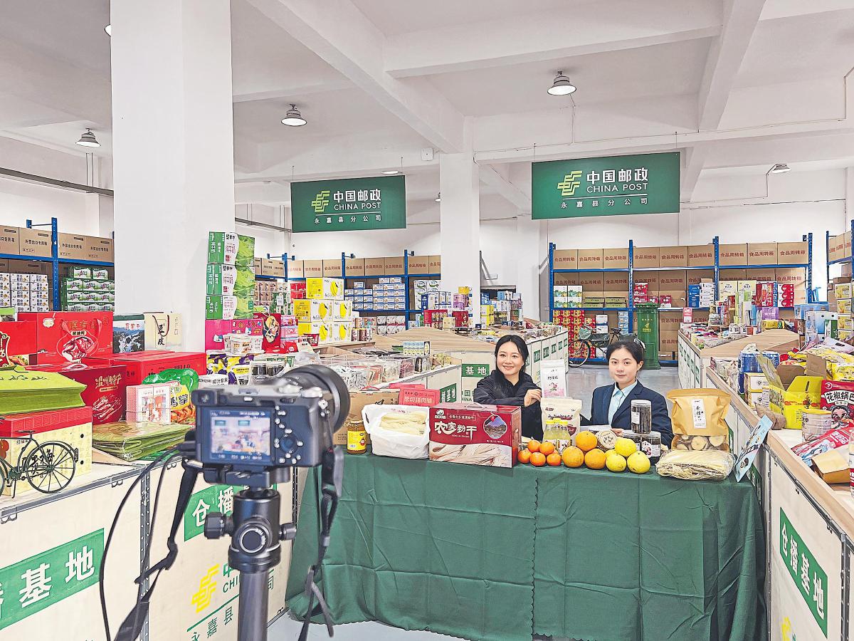 永嘉邮政组织“邮乐小店”店主在仓储中心进行直播。 □周欣新 摄