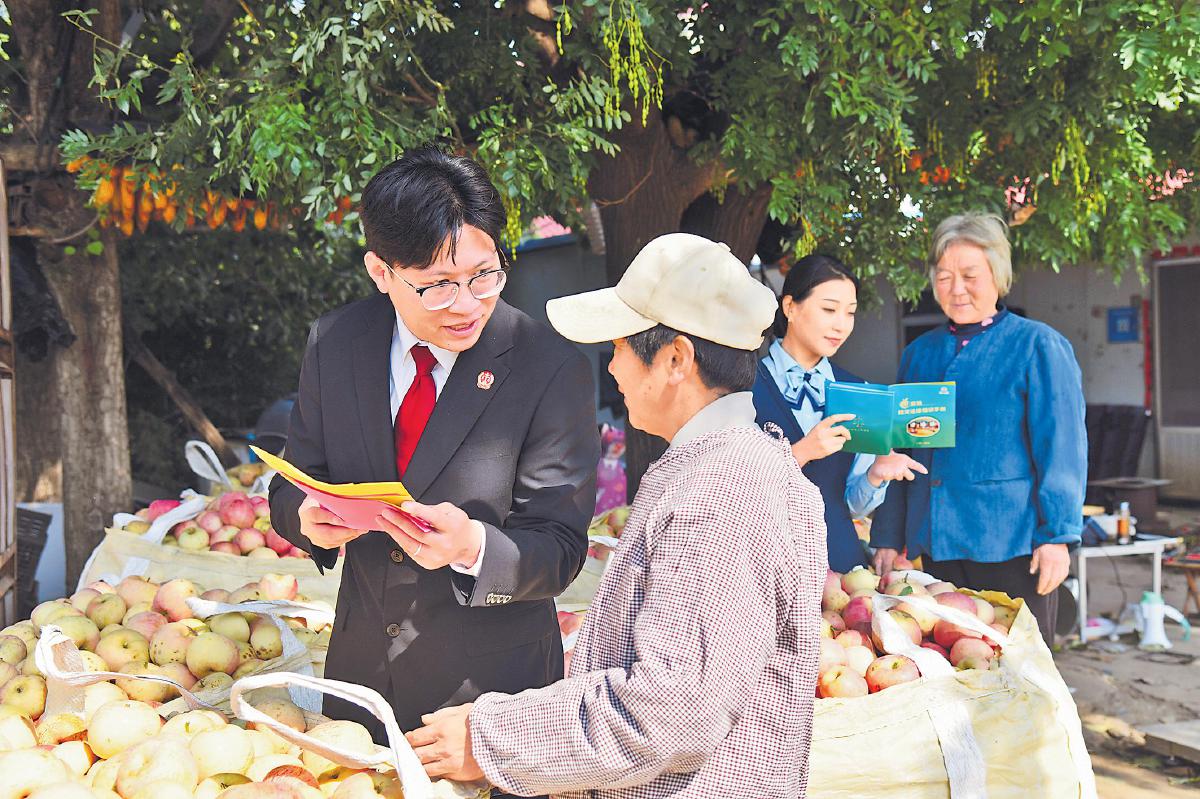 10月21日,沂源县人民法院四级法官助理黄旭东和邮政工作人员一起在北店子村向果农宣讲法律知识。
