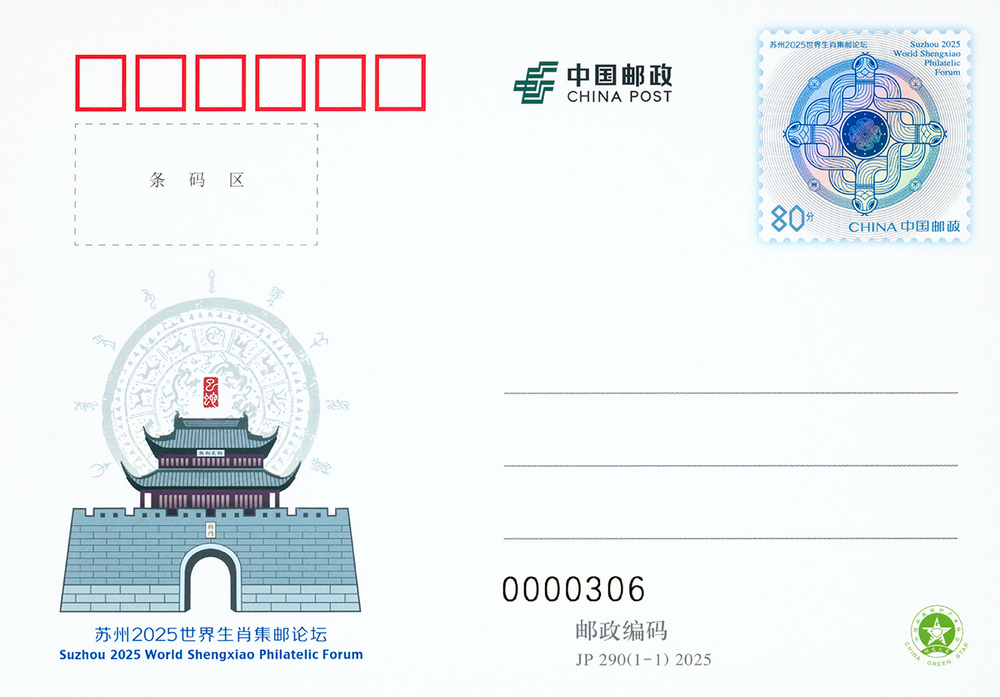 中国邮政定于2025年2月15日发行《苏州2025世界生肖集邮论坛》纪念邮资明信片1套1枚。详情如下: