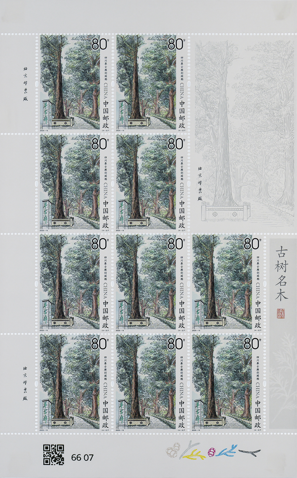 中国邮政定于2025年8月15日发行《古树名木》特种邮票1套4枚,邮票图案名称为:山东定林寺银杏、四川翠云廊剑阁柏、山西晋祠国槐、浙江普陀山普陀鹅耳枥。全套邮票面值4.00元,计划发行数量为470万套。